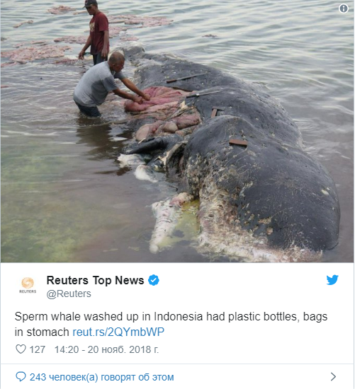 В Индонезии на берег выбросило мертвого кита, у которого в желудке обнаружили шесть килограммов пластика, в том числе 115 пластиковых стаканчиков и два шлепанца. Об этом сообщает агентство Associated Press.