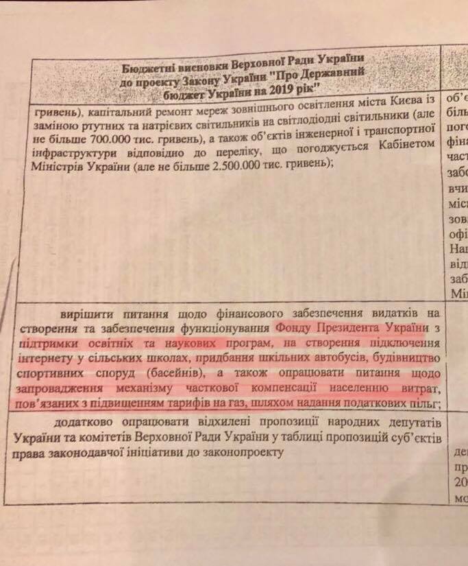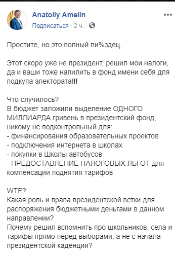 Предприниматель Анаталий Амелин разместил в Facebook выдержку из документов Верховной Рады по проекту госбюджета на 2019 год из которого следует, что в проект заложен миллиард гривен для президентского фонда.