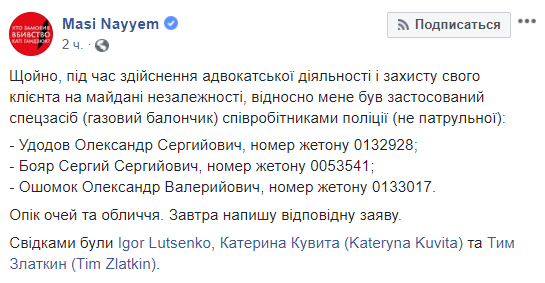 "Только что, при осуществлении адвокатской деятельности и защиты своего клиента на Майдане Незалежности, в отношении меня было применено спецсредство (газовый баллончик) сотрудниками полиции (Не патрульной):