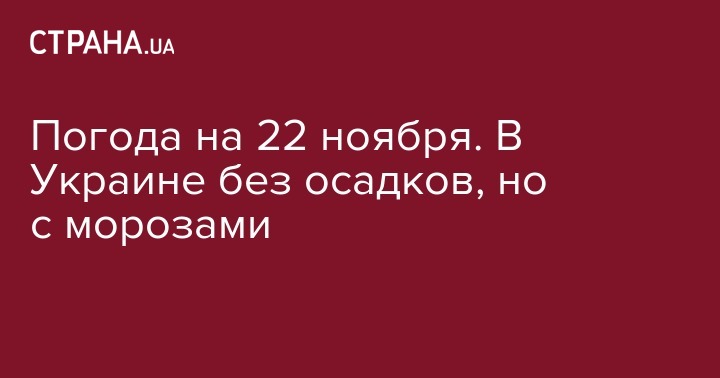 На западе Украины без осадков. Ночью -2...-4 мороза, днем ​​+1...-3 тепла. Жителей севера 22 ноября ожидает морозная и солнечная погода. Ночью -5...-7, днем ​​от 0...-2 мороза. Холодно и без осадков будет сегодня и на востоке страны. Ночная температура воздуха -4...-6 мороза, дневная от -1 до +1 тепла. На юге 22 ноября ночью ожидаются морозы -2...-4 градуса от 0 до +2 днем. Солнечно, без осадков.