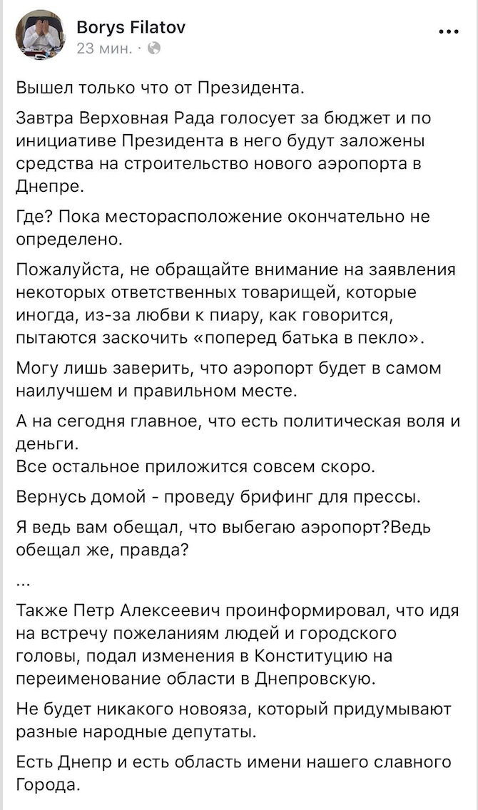 "Завтра Верховная Рада голосует за бюджет и по инициативе Президента в него будут заложены средства на строительство нового аэропорта в Днепре.