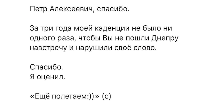 По крайней мере мэр города после встречи на Банковой вышел сильно воодушевленный и разразился в адрес Порошенко славословиями: "Петр Алексеевич, спасибо. За три года моей каденции не было ни одного раза, чтобы Вы не пошли Днепру навстречу и нарушили свое слово. Спасибо. Я оценил".