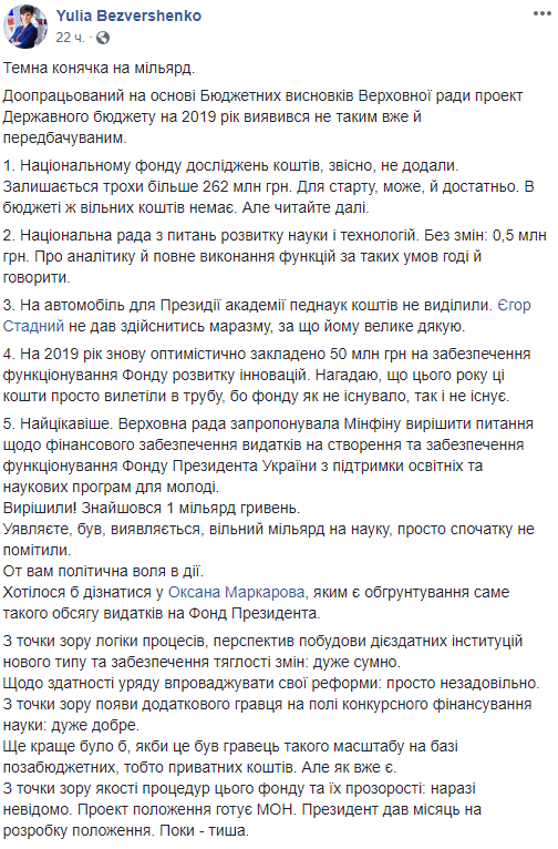 Преподаватель Киево-Могилянской академии Юлия Безвершенко сравнивает "миллиард Порошенко" с другими бюджетными тратами на науку: