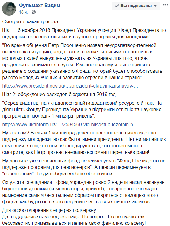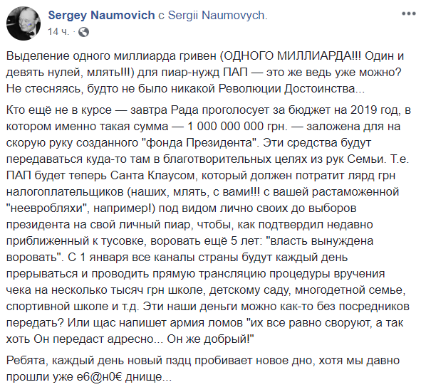 Кто ещё не в курсе — завтра Рада проголосует за бюджет на 2019 год, в котором именно такая сумма — 1 000 000 000 грн. — заложена для на скорую руку созданного "фонда Президента". Эти средства будут передаваться куда-то там в благотворительных целях из рук Семьи. Т.е. ПАП будет теперь Санта Клаусом, который должен потратит лярд грн налогоплательщиков (наших, млять, с вами!!! с вашей растаможенной "неевробляхи", например!) под видом лично своих до выборов президента на свой личный пиар, чтобы, как подтвердил недавно приближенный к тусовке, воровать ещё 5 лет: "власть вынуждена воровать".