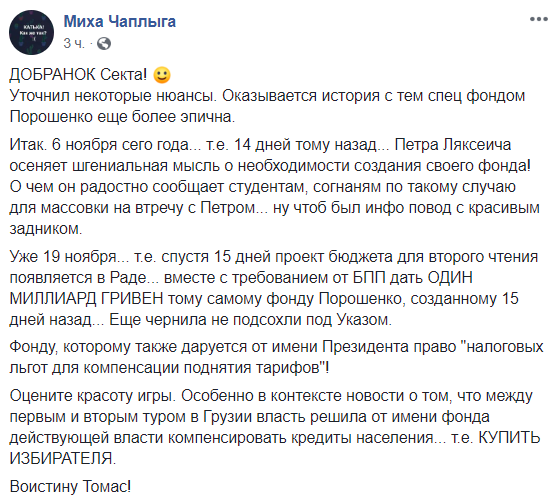 Уже 19 ноября... т.е. спустя 15 дней проект бюджета для второго чтения появляется в Раде... вместе с требованием от БПП дать ОДИН МИЛЛИАРД ГРИВЕН тому самому фонду Порошенко, созданному 15 дней назад... Еще чернила не подсохли под Указом.