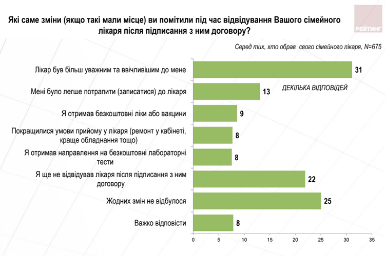 Четверть украинцев не увидели никаких изменений после заключения договора с семейным врачом, а еще 22% вообще не были у своего врача после подписания контракта. Такие данные получила Социологическая группа "Рейтинг" по результатам опроса, проведенного в октябре.