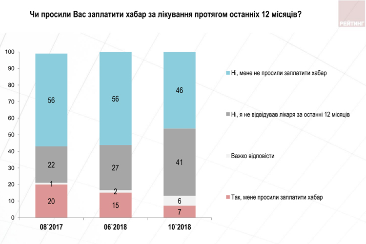 В то же время четверть украинцев не увидели никаких изменений после заключения договора, а еще 22% вообще не были у своего врача после подписания контракта. 7% респондентов заявили, что у столкнулись с фактами коррупции при получении медицинских услуг. 46% говорят, что за последних 12 месяцев у них не просили заплатить взятку за лечение. Еще в июне таких было на 10% больше.