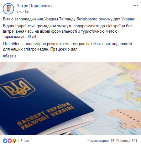 Глава государства отметил, что теперь украинцы смогут 30 дней находиться в Таиланде в туристических целях без оформления визы. Порошенко отметил, что география безвизовых поездок для украинцев расширяется в рамках выполнения его обещания.