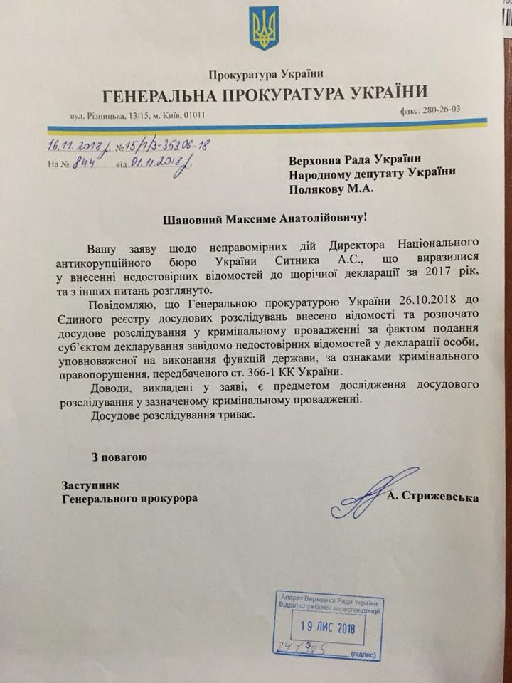 В то же время сам автор обращения, которое и стало основанием открытия уголовного производства, народный депутат Украины от фракции "Народный фронт" Максим Поляков на своей странице в Facebook заявил, что уголовное дело открыто по факту декларирования Сытником и членами его семьи недостоверной информации.