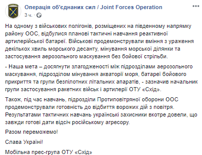 На одном из военных полигонов, размещенных на южном направлении района ООС, прошли плановые тактические учения реактивной артиллерийской батареи. Об этом сообщает пресс-центр штаба ООС в соцсети.