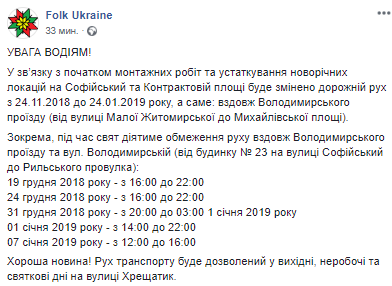 "Внимание водителям! В связи с началом монтажных работ и оборудования новогодних локаций на Софийской и Контрактовой площадях будет изменено дорожное движение с 24 ноября до 24 января 2019 года, а именно: вдоль Владимирского проезда (от улицы Малой Житомирской до Михайловской площади)", - предупредили организаторы.