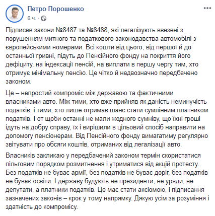 "Теперь водители, которые покупают авто на европейских номерах, платить 500 евро не контрабандистам, а в бюджет. Главное - закройте границы для контрабандистов, научитесь жить в цивилизованном государстве", - сказал Порошенко.