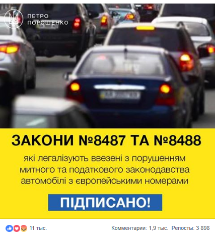 23 ноября президент Украины Петр Порошенко подписал закон о растаможке автомобилей на иностранных номерах. Глава государства полагает, что в целом украинцы поддерживают законопроекты №8487 и №8488, потому что его пост в Facebook, посвященный принятию закона, набрал более 10 тысяч лайков. Об этом он сообщил во время встречи со студентами в Киеве, передает "Украинская правда"