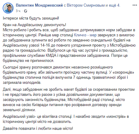 "Сегодня утром начался демонтаж незаконно размещенного строительного крана, чтобы освободить проезжую часть улицы. У "охранников" строительства столичная полиция изъяла 7 единиц травматического оружия и задержала молодых людей", - написал Мондриевский.