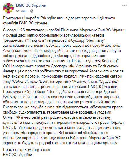 "О намерении осуществлять переход заранее были проинформированы в соответствии с международными нормами в целях обеспечения безопасности судоходства. Однако, вопреки Конвенции ООН по морскому праву и Договора между Украиной и Российской Федерацией о сотрудничестве в использовании Азовского моря и Керченского пролива, пограничные корабли РФ - пограничные катера типа "Соболь", ПСКР "Дон", катера типа "Мангуст", МПК "Суздалец "осуществили откровенно агрессивные действия против кораблей ВМС ВС Украины", - сказано в сообщении.