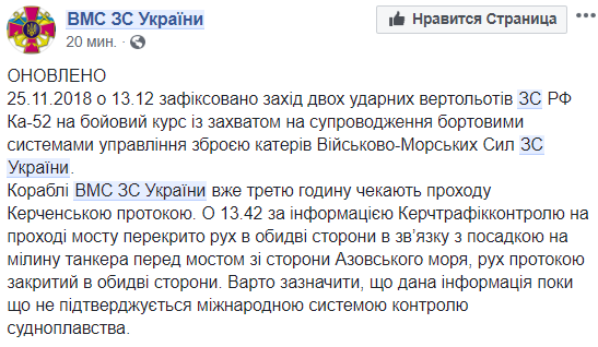 "Уже пятый час в российских территориальных водах в акватории Черного моря продолжаются провокационные действия трех судов МВФ Украины. Их цель понятна — создать конфликтную ситуацию в этом регионе. Погранслужбой ФСБ России предпринимаются все необходимые меры для пресечения этой преднамеренной провокации украинского руководства и обеспечения безопасности судоходства", — передают российские СМИ сообщение ФСБ.