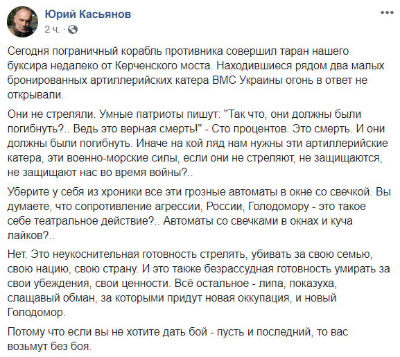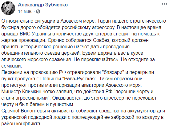"Относительно ситуации в Азовском море. Таран нашего стратегического буксира дорого обойдется российскому агрессору. В настоящее время армада ВМС Украины в количестве двух катеров спешит на помощь к жертве провокации. Срочно собирается Совбез, который должен принять историческое решение насчет даты проведения объединительного съезда церквей. Будем держать вас в курсе эпического морского сражения. Не переключайтесь. Не отходите за семками.