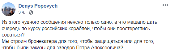 Мы строим бронекатера для того, чтобы защищаться или для того, чтобы были заказы для заводов Петра Алексеевича?", - пишет журналист Денис Попович.