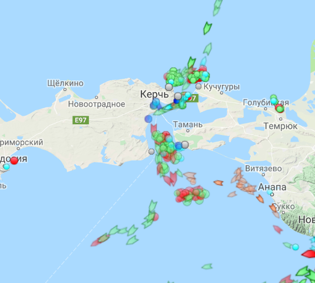 По данным сервиса отслеживания морского движения, в Керченском проливе на данный момент - "пробка" из судов. Что подтверждает слухи о перекрытии пролива для гражданских кораблей. И о возможном "затонувшем танкере".