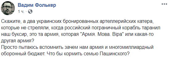 "Скажите, а два украинских бронированных артеллерийских катера, которые не стреляли, когда российский пограничный корабль таранил наш буксир, это та армия, которая "Армiя. Мова. Вiра" или какая-то другая армия?