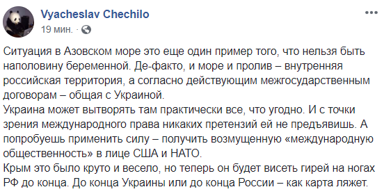 "Ситуация в Азовском море это еще один пример того, что нельзя быть наполовину беременной. Де-факто, и море и пролив – внутренняя российская территория, а согласно действующим межгосударственным договорам – общая с Украиной.