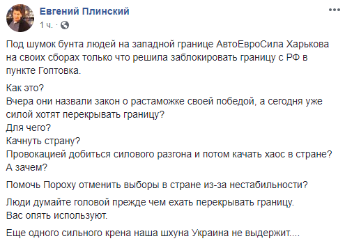 "Вчера они назвали закон о растаможке своей победой, а сегодня уже силой хотят перекрывать границу? Для чего? Качнуть страну? Провокацией добиться силового разгона и потом качать хаос в стране? А зачем Помочь Пороху отменить выборы в стране из-за нестабильности? Люди думайте головой прежде чем ехать перекрывать границу. Вас опять используют", - написал он.