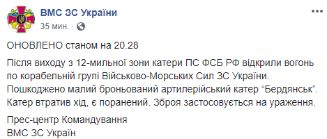 По данным ВМС Украины, по состоянию на 20:28, после выхода из 12-мильной зоны катера ФСБ РФ открыли огонь по корабельной группе Военно-морских сил ВС Украины. Поврежден малый бронированный артиллерийский катер "Бердянск". Катер потерял ход, есть раненый. Оружие применяется на поражение".