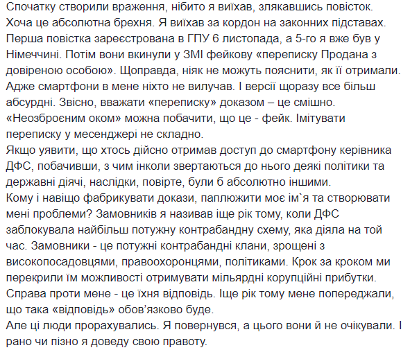 "Я выехал за границу на законных основаниях. Первая повестка зарегистрирована в ГПУ 6 ноября, а 5-го я уже был в Германии", - написал Продан в Facebook.