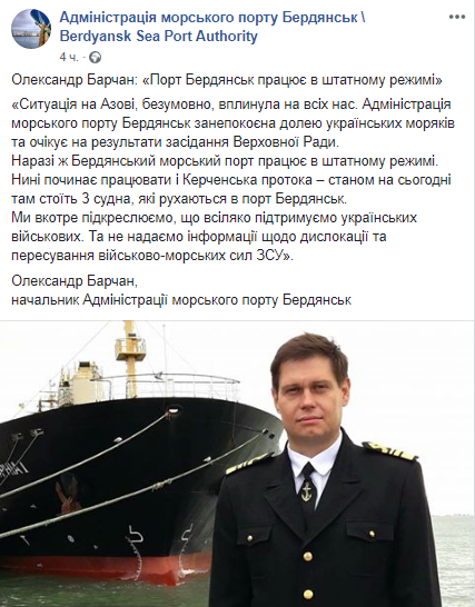 В частности, по информации начальника администрации морского порта Бердянск Александра Барчана, в Бердянском морском порту ожидают прибытия трех судов, которые стоят в Керченском проливе. Также сообщается, что в порту поддерживают украинских военных и не передают информацию о дислокации ВМС ВСУ.