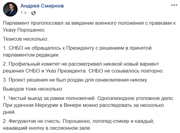 "Парламент проголосовал за введение военного положения с правками к Указу Порошенко.