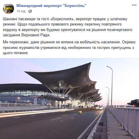 "Уважаемые пассажиры и гости "Борисполя", аэропорт работает в штатном режиме. По дальнейшему правовому режиму пересечения воздушной границы в аэропорту мы будем ориентироваться на решение внеочередного заседания Верховной Рады.