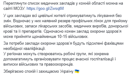 Также она сообщила, что Министерство здравоохранения Украины и Министерство обороны Украины приняли совместный приказ, чтобы все защитники украинских границ и национальной безопасности при необходимости могли своевременно получить необходимую медицинскую помощь в условиях военного положения.