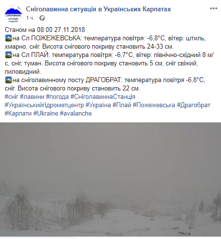 На вершине Пожижевская температура опустилась ниже -6 градусов, и здесь выпало около 24-33 см снега. На горе Плай была зафиксирована такая же температура, туман, но нападало всего 5 см снега. А на Драгобрате насыпало 22 см снега, термометр показывал около -7 градусов.