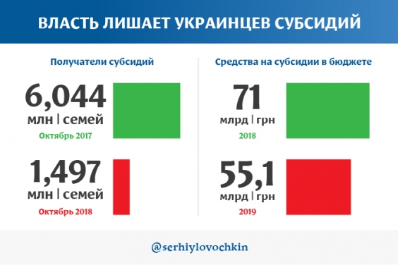 "На начало отопительного сезона почти 4,6 млн украинских семей не смогли переоформить жилищно-коммунальную субсидию, которую получали раньше.  Если в октябре 2017 года субсидию получали 6,044 млн домохозяйств, то в октябре 2018 года их количество сократилось до 1,497 млн или на 75%. Это следствие необоснованного ужесточения правил предоставления субсидий, инициированных властью в апреле нынешнего года", - заявил Сергей Лёвочкин.