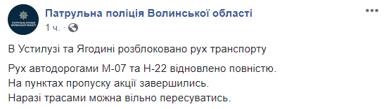 В патрульной полиции Волынской области заявили, что движение к пункту пропуску "Ягодин" разблокировано. "В "Устилуге" и "Ягодине" разблокировано движение транспорта. Движение по автодорогам М-07 и Н-22 восстановлено полностью. На пунктах пропуска акции завершились. Сейчас трассами можно свободно передвигаться", - говорится в сообщении, размещенном на сайте ведомства в Facebook.