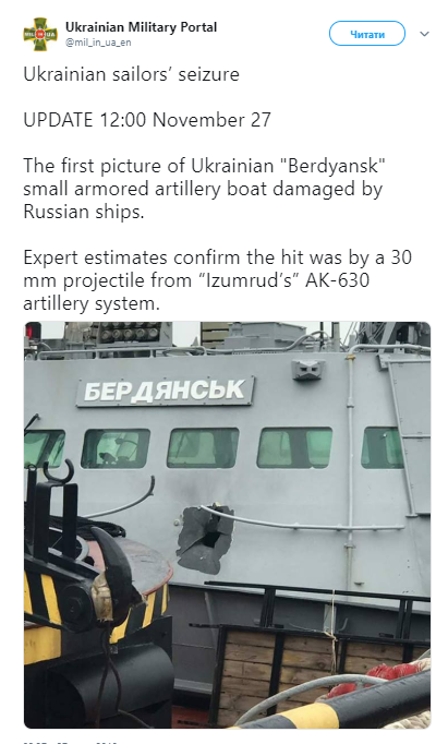 По данным портала, эксперты подтверждают, что удар был нанесен 30-миллиметровым снарядом из артиллерийской системы АК-630, установленной на российском пограничном катере "Изумруд".