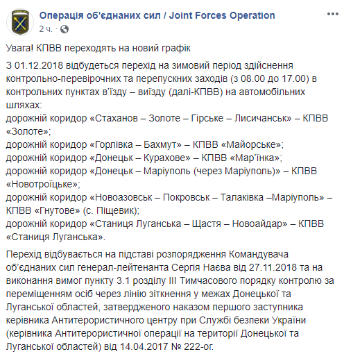 Контрольные пункты въезда-выезда в зоне проведения ООС переходят на зимний график работы, время работы сокращается на пять часов. Об этом сообщает пресс-центр штаба ООС на странице в Facebook.