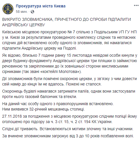 Киевской местной прокуратурой совместно с Подольским УП ГУ ЧП в г. Киеве по результатам проведенного комплекса следственных и негласных следственных действий установлена личность одного из злоумышленников, пытавшихся поджечь Андреевскую церковь на Подоле. Об этом во вторник, 27 ноября, сообщает пресс-служба прокуратуры Киева в Facebook.
