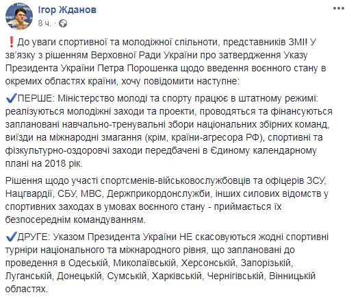 "Указом президента Украины НЕ отменяются никакие спортивные турниры национального и международного уровня, которые запланированы к проведению в Одесской, Николаевской, Херсонской, Запорожской, Луганской, Донецкой, Сумской, Харьковской, Черниговской, Винницкой областях", - указано в опубликованном сообщении.