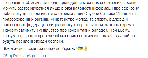 Сообщается, что Министерство молодежи и спорта работает в штатном режиме: реализуются молодежные мероприятия и проекты, проводятся и финансируются запланированные учебно-тренировочные сборы национальных сборных, выезды на международные соревнования (кроме страны-агрессора РФ), спортивные и физкультурно-оздоровительные мероприятия, предусмотренные в Едином календарном плане на 2018 год.