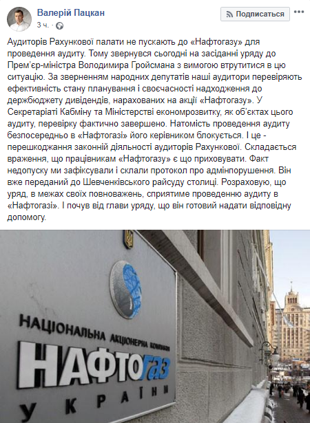 Председатель Счетной палаты Валерий Пацкан заявил, что аудиторов Счетной палаты, которые по обращению депутатов должны были проверить своевременность поступления дивидендов в бюджет, не пустили в "Нафтогаз". Об этом написал на своей странице в Facebook.