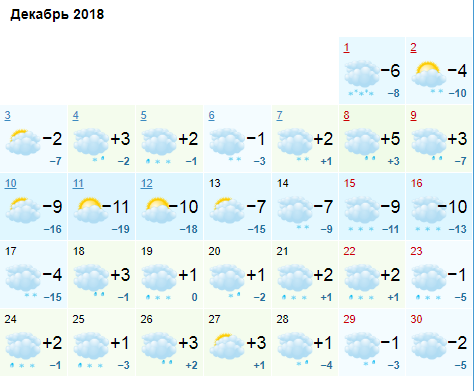 По данным Gismeteo, первые два дня декабря будут морозными, до -4...-6 днем. Затем потеплеет до +2..+5, возможен дождь с мокрым снегом. С 10 по 16 января вновь похолодает: -7...-11 днем. Временами будет идти снег. После морозного периода и до конца месяца дневная температура составит +1...+2, возможен мокрый снег.