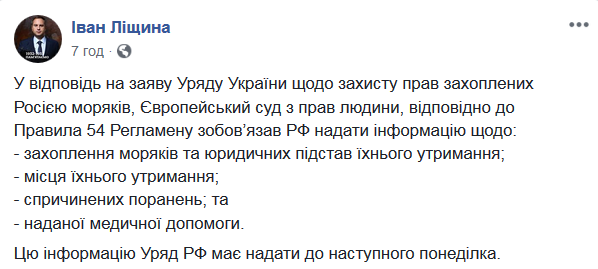 Об этом заместитель министра юстиции Украины - уполномоченный по вопросам Европейского суда по правам человека Иван Лищина сообщил на своей странице в Facebook.