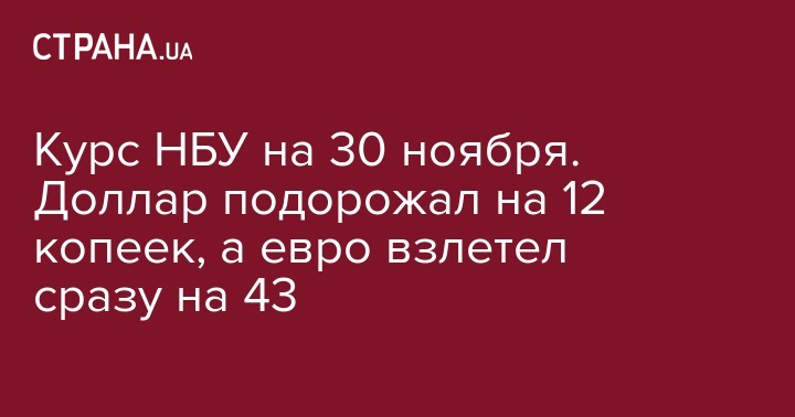 Также НБУ повысил и курс евро, причем сразу на 43 копейки до 32,33 гривен за евро. Официальный курс евро на 30 ноября установлен на уровне 3232,8754 гривни за 100 евро (+42,9959 грн). Подорожание евро вызвано ростом курс единой европейской валюты к доллару на международном рынке.