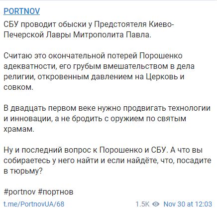 "По информации адвоката, присутствующего на противоправном обыске у Митрополита Павла, СБУ изъяла у него только эту книгу. Продолжаются обыски на других объектах", - написал Портнов.