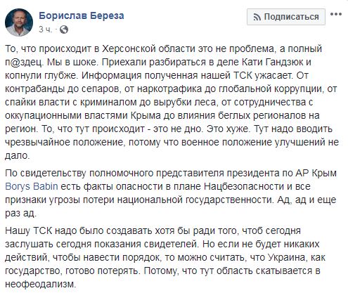 Власти Херсонской области сотрудничают с российскими властями Крыма, в регионе есть все признаки угрозы потери национальной государственности. Об этом заявил председатель временной следственной комиссии (ВСК) Верховной Рады по убийству Екатерины Гандзюк Борислав Береза в Facebook.