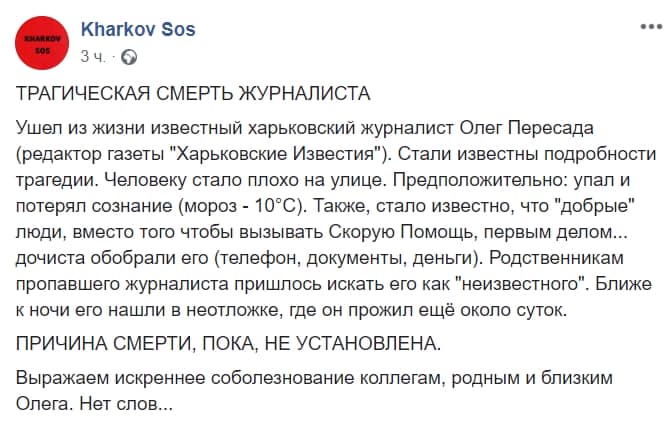 В Харькове известный журналист умер на улице от обморожения. Его сразу же ограбили