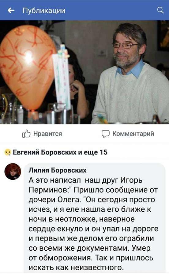 "Пришло сообщение от дочери Олега: "Он сегодня просто исчез, и я еле нашла его ближе к ночи в "неотложке". Наверное, сердце екнуло, и он упал на дороге. И первым делом его ограбили со всеми же документами. Умер от обморожения. Так и пришлось искать как неизвестного", - сообщила в Facebook харьковчанка Лилия Боровских.