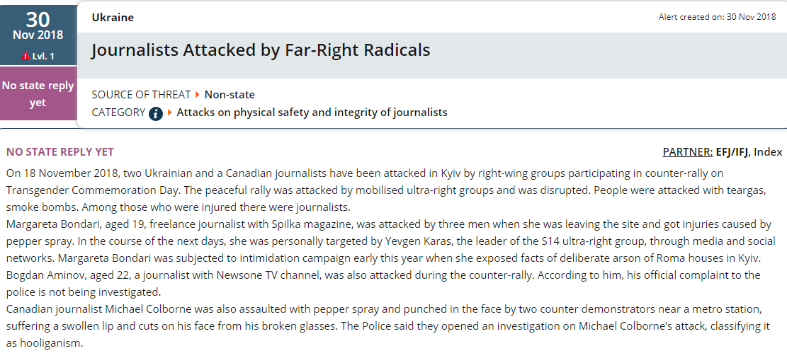 "18 ноября 2018 года два украинских и один канадский журналист подверглись нападению в Киеве правыми группами, участвовавшими протестах против проведения митинга в честь Дня памяти трансгендеров. Мирный митинг был атакован мобилизованными ультраправыми группами. Против людей применяли слезоточивый газ, дымовые шашки. Среди пострадавших были журналисты", - говорится в сообщении.
