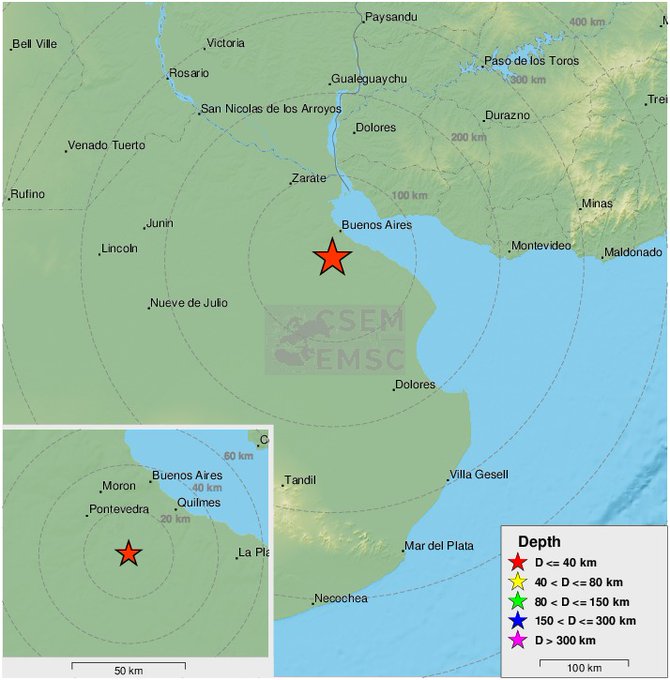 По данным Национального института Аргентины по предотвращению сейсмических активностей, землетрясение магнитудой 3,8 произошло на глубине 25 километров в 33 километрах от Буэнос-Айреса.